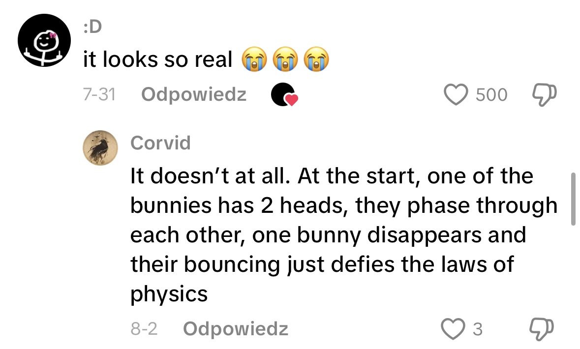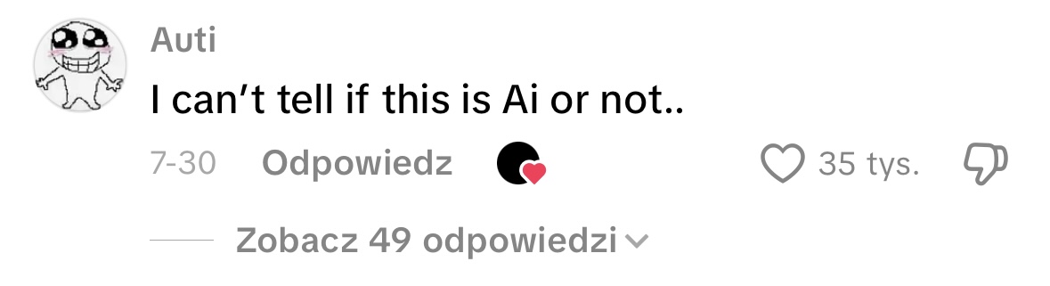 Od strony użytkowników - nowe rodzaje contentu. Poza oczywistymi filmikami AI, są też takie, które świadomie próbują mylić i testować twoją czujność. Można nawet posilić się o tezę, że pełnią funkcję niejako edukacyjną i uświadamiającą. Pokazują najnowsze możliwości AI, a po ich obejrzeniu, na pewno nie spojrzy się na kolejny filmik na feedzie tak samo.